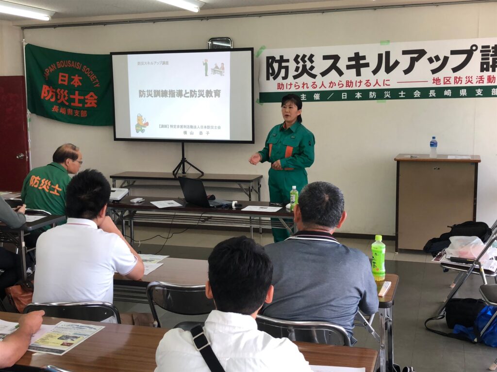 防災スキルアップ講座(H30諫早市) 2018.07.012025.07.29防災スキルアップ講座「防災指導訓練と防災教育」平成30年7月1日諫早市中央公民館日本防災士会長崎県支部の「防災スキルアップ講座」を諫早市中央公民館にて開催しました。横山恭子さんの二時間に渡る素晴らしい講義を大好評のうちに終えることができました。講師:横山恭子(NPO日本防災士会理事)